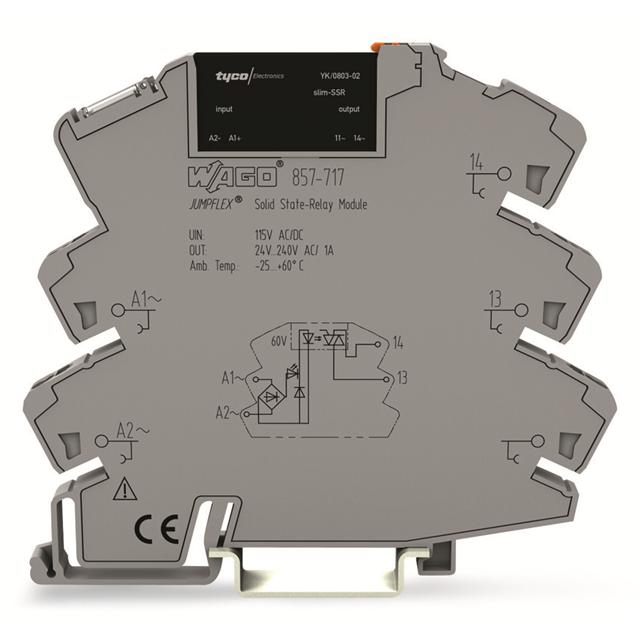 This is manufactured by WAGO Corporation. The manufacturer part number is 857-717. It is assigned with possible HTSUS value of 8536.41.0030. The product is rohs3 compliant. Moreover, it has spring terminal terminal style. Moreover, the product comes in [Package/ Case]. The possible product's input voltage is 115vac/dc. It has a typical 2 a load current. Furthermore, it has aac, zero cross output. It is shipped in box. Its typical moisture sensitivity level is not applicable. It has an integral spst-no (1 form a) circuit. It has a long 12 weeks standard lead time. The product is available in din rail configuration. The product 857, is a highly preferred choice for users. The given load voltage is 24 v ~ 240 v. The product is designated with the ear99 code number