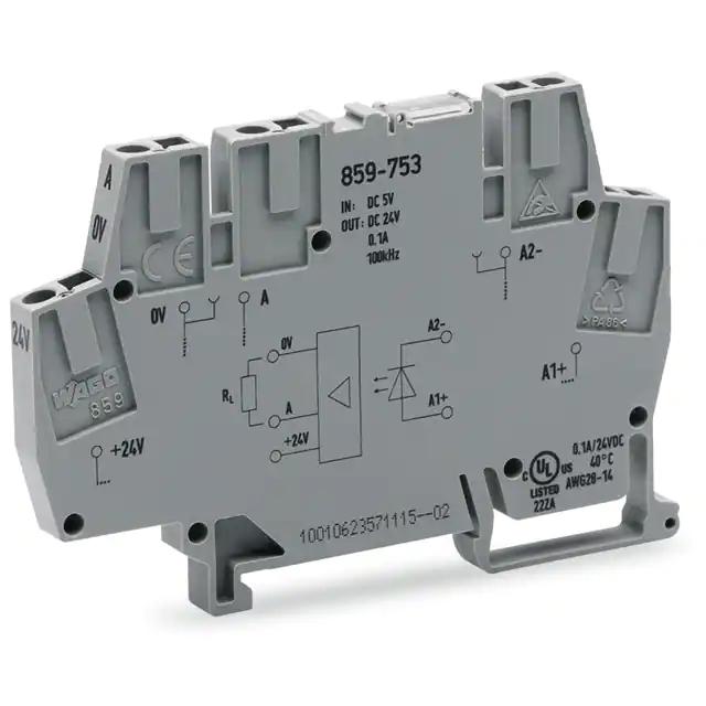 This is manufactured by WAGO Corporation. The manufacturer part number is 859-753. It is assigned with possible HTSUS value of 8536.41.0030. The product is rohs3 compliant. Moreover, it has spring terminal terminal style. Moreover, the product comes in [Package/ Case]. The possible product's input voltage is 5vdc. It has a typical 100 ma load current. Furthermore, it has adc output. It is shipped in box. Its typical moisture sensitivity level is not applicable. It has an integral spst-no (1 form a) circuit. It has a long 12 weeks standard lead time. The product is available in din rail configuration. The product 859, is a highly preferred choice for users. The given load voltage is 20 v ~ 28.8 v. The product is designated with the ear99 code number