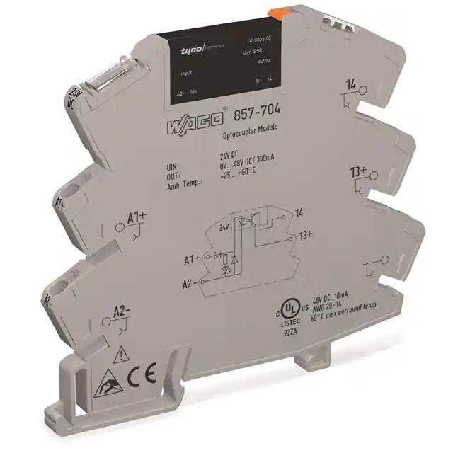 This is manufactured by WAGO Corporation. The manufacturer part number is 857-704. It is assigned with possible HTSUS value of 8536.41.0030. The product is rohs3 compliant. Moreover, it has spring terminal terminal style. Moreover, the product comes in [Package/ Case]. The possible product's input voltage is 24vdc. It has a typical 100 ma load current. Furthermore, it has adc output. It is shipped in box. Its typical moisture sensitivity level is not applicable. It has an integral spst-no (1 form a) circuit. It has a long 12 weeks standard lead time. The product is available in din rail configuration. The product 857, is a highly preferred choice for users. The given load voltage is 0 v ~ 48 v. The product is designated with the ear99 code number