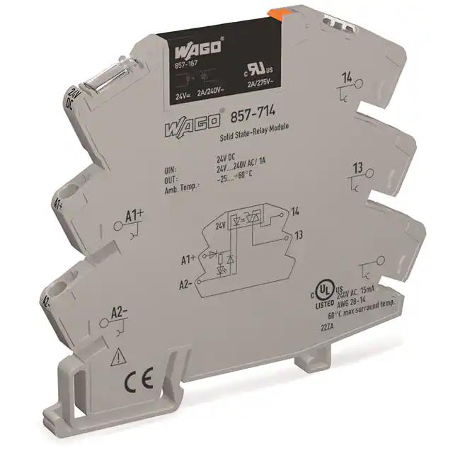 This is manufactured by WAGO Corporation. The manufacturer part number is 857-714. It is assigned with possible HTSUS value of 8536.41.0030. The product is rohs3 compliant. Moreover, it has spring terminal terminal style. Moreover, the product comes in [Package/ Case]. The possible product's input voltage is 24vdc. It has a typical 2 a load current. Furthermore, it has aac, zero cross output. It is shipped in box. Its typical moisture sensitivity level is not applicable. It has an integral spst-no (1 form a) circuit. It has a long 12 weeks standard lead time. The product is available in din rail configuration. The product 857, is a highly preferred choice for users. The given load voltage is 24 v ~ 240 v. The product is designated with the ear99 code number