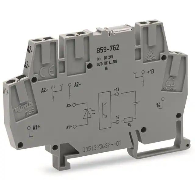 This is manufactured by WAGO Corporation. The manufacturer part number is 859-762. It is assigned with possible HTSUS value of 8536.41.0030. The product is rohs3 compliant. Moreover, it has spring terminal terminal style. Moreover, the product comes in [Package/ Case]. The possible product's input voltage is 24vdc. It has a typical 3 a load current. Furthermore, it has adc output. It is shipped in box. Its typical moisture sensitivity level is not applicable. It has an integral spst-no (1 form a) circuit. It has a long 12 weeks standard lead time. The product is available in din rail configuration. The product 859, is a highly preferred choice for users. The given load voltage is 3 v ~ 30 v. The product is designated with the ear99 code number
