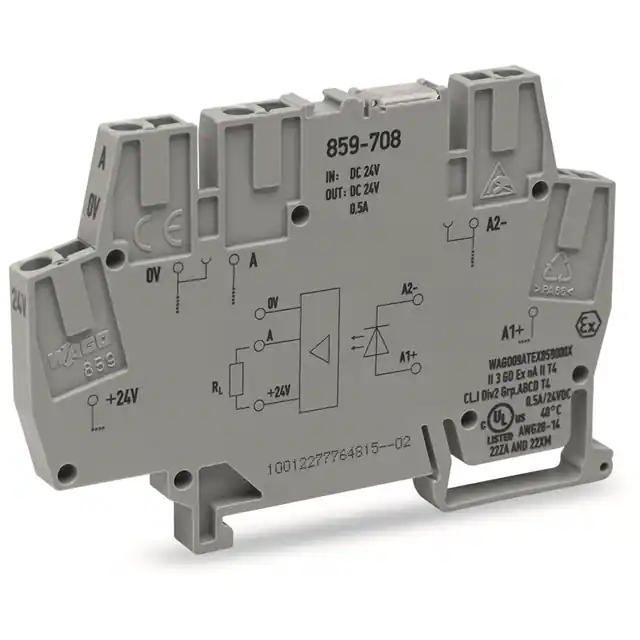 This is manufactured by WAGO Corporation. The manufacturer part number is 859-708. It is assigned with possible HTSUS value of 8536.41.0030. The product is rohs3 compliant. Moreover, it has spring terminal terminal style. Moreover, the product comes in [Package/ Case]. The possible product's input voltage is 24vdc. It has a typical 500 ma load current. Furthermore, it has adc output. It is shipped in box. Its typical moisture sensitivity level is not applicable. It has an integral spst-no (1 form a) circuit. It has a long 12 weeks standard lead time. The product is available in din rail configuration. The product 859, is a highly preferred choice for users. The given load voltage is 20 v ~ 30 v. The product is designated with the ear99 code number