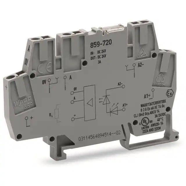 This is manufactured by WAGO Corporation. The manufacturer part number is 859-720. It is assigned with possible HTSUS value of 8536.41.0030. The product is rohs3 compliant. Moreover, it has spring terminal terminal style. Moreover, the product comes in [Package/ Case]. The possible product's input voltage is 24vdc. It has a typical 3 a load current. Furthermore, it has adc output. It is shipped in box. Its typical moisture sensitivity level is not applicable. It has an integral spst-no (1 form a) circuit. It has a long 12 weeks standard lead time. The product is available in din rail configuration. The product 859, is a highly preferred choice for users. The given load voltage is 10 v ~ 30 v. The product is designated with the ear99 code number