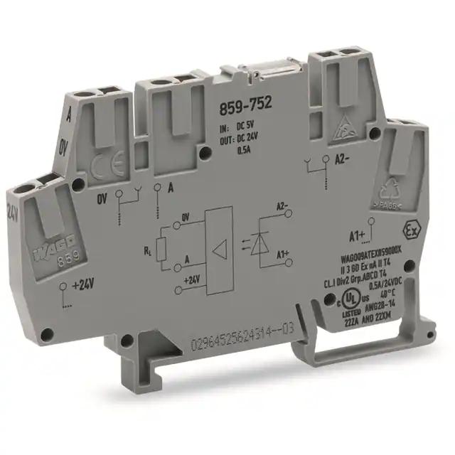 This is manufactured by WAGO Corporation. The manufacturer part number is 859-752. It is assigned with possible HTSUS value of 8536.41.0030. The product is rohs3 compliant. Moreover, it has spring terminal terminal style. Moreover, the product comes in [Package/ Case]. The possible product's input voltage is 5vdc. It has a typical 500 ma load current. Furthermore, it has adc output. It is shipped in box. Its typical moisture sensitivity level is not applicable. It has an integral spst-no (1 form a) circuit. It has a long 12 weeks standard lead time. The product is available in din rail configuration. The product 859, is a highly preferred choice for users. The given load voltage is 20 v ~ 30 v. The product is designated with the ear99 code number