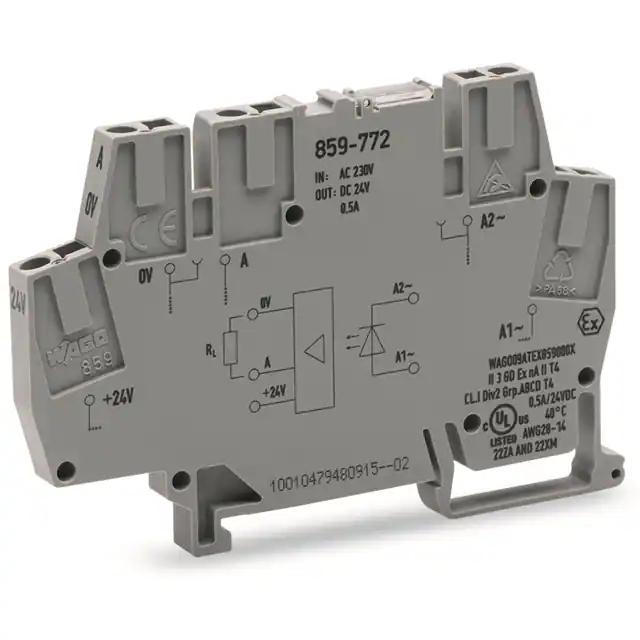 This is manufactured by WAGO Corporation. The manufacturer part number is 859-772. It is assigned with possible HTSUS value of 8536.41.0030. The product is rohs3 compliant. Moreover, it has spring terminal terminal style. Moreover, the product comes in [Package/ Case]. The possible product's input voltage is 230vac. It has a typical 500 ma load current. Furthermore, it has adc output. It is shipped in box. Its typical moisture sensitivity level is not applicable. It has an integral spst-no (1 form a) circuit. It has a long 12 weeks standard lead time. The product is available in din rail configuration. The product 859, is a highly preferred choice for users. The given load voltage is 20 v ~ 30 v. The product is designated with the ear99 code number