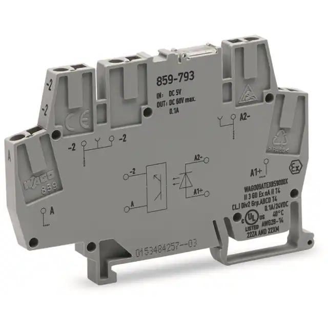 This is manufactured by WAGO Corporation. The manufacturer part number is 859-793. It is assigned with possible HTSUS value of 8536.41.0030. The product is rohs3 compliant. Moreover, it has spring terminal terminal style. Moreover, the product comes in [Package/ Case]. The possible product's input voltage is 5vdc. It has a typical 100 ma load current. Furthermore, it has adc output. It is shipped in box. Its typical moisture sensitivity level is not applicable. It has an integral spst-no (1 form a) circuit. It has a long 12 weeks standard lead time. The product is available in din rail configuration. The product 859, is a highly preferred choice for users. The given load voltage is 3 v ~ 60 v. The product is designated with the ear99 code number
