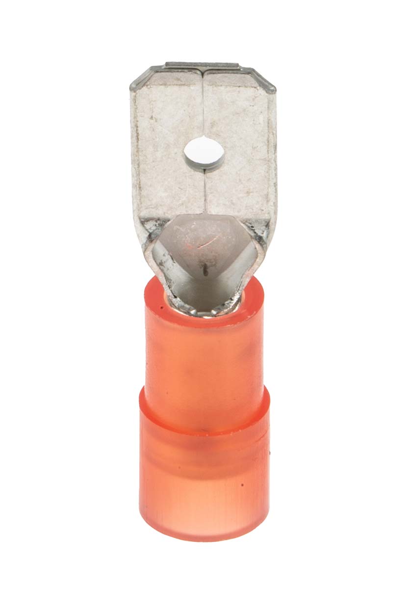 This is Red Insulated Crimp Tab Terminal 0.5mm² to 1.5mm² 22AWG to 16AWG 0.8 x 6.35mm manufactured by RS Pro. The manufacturer part number is 267-4029. The bespoke tab is 6.35mm thick. The tab is 0.8mm wide. In addition, male is the available "Gender" of the product. It has a robust nylon insulation material. Insulation Option: insulated. The product is made from sturdy brass materials.