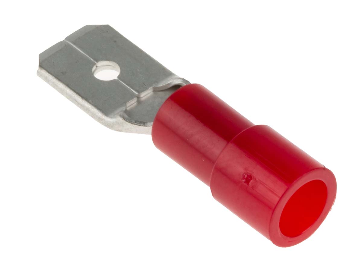 This is Red Insulated Crimp Tab Terminal 0.5mm² to 1.5mm² 22AWG to 16AWG 0.8 x 6.35mm manufactured by RS Pro. The manufacturer part number is 613-9744. The bespoke tab is 6.35mm thick. The tab is 0.8mm wide. In addition, male is the available "Gender" of the product. It has a robust pc insulation material. Insulation Option: insulated. It comes in tab configuration. The product is made from sturdy brass materials.