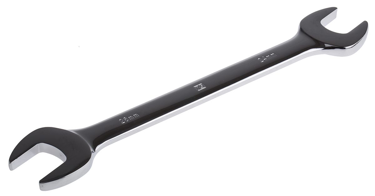 This is 24mmx26mm Double Ended Open Spanner 293 mm length manufactured by RS Pro. The manufacturer part number is 495-3835. A quality product with a nice chrome finish. The product is made from highly stable and reliable chrome vanadium steel. The product is available in 24 x 26 mm size.
