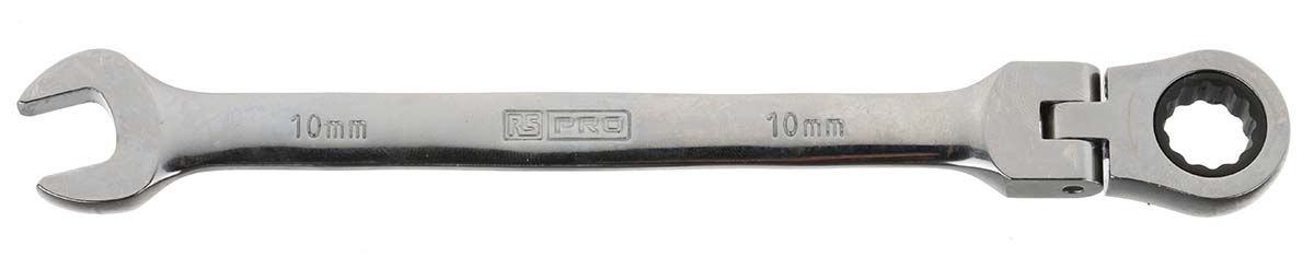 This is 10 mm Combination Ratchet Spanner Pivot Head; Flexible 160 mm Length manufactured by RS Pro. The manufacturer part number is 487-220. A quality product with a nice chrome finish. The product is made from highly stable and reliable chrome vanadium steel. The product is available in 10 mm size.