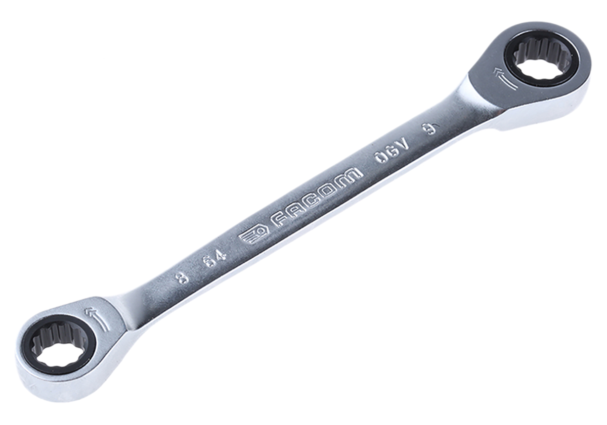 This is 8 x 9 mm Ratchet Ring Spanner Ultra-Compact Ring Head 128 mm Length manufactured by Facom. The manufacturer part number is 64.8X9. A quality product with a nice satin chrome finish. The product is available in 8 x 9 mm size.
