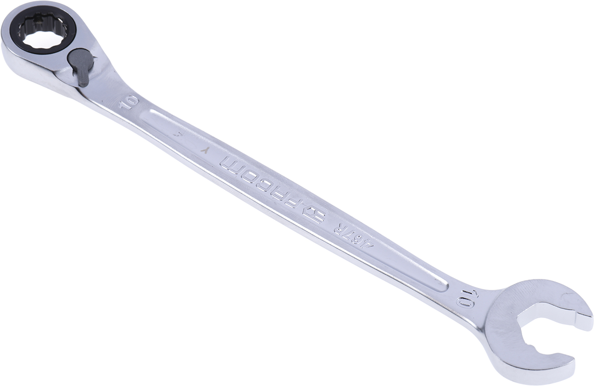 This is RAPID COMB RATCHETING WRENCH 10MM manufactured by Facom. The manufacturer part number is 467BR.10. A quality product with a nice chrome finish. The product is made from highly stable and reliable chrome vanadium steel. The product is available in 10 mm size.