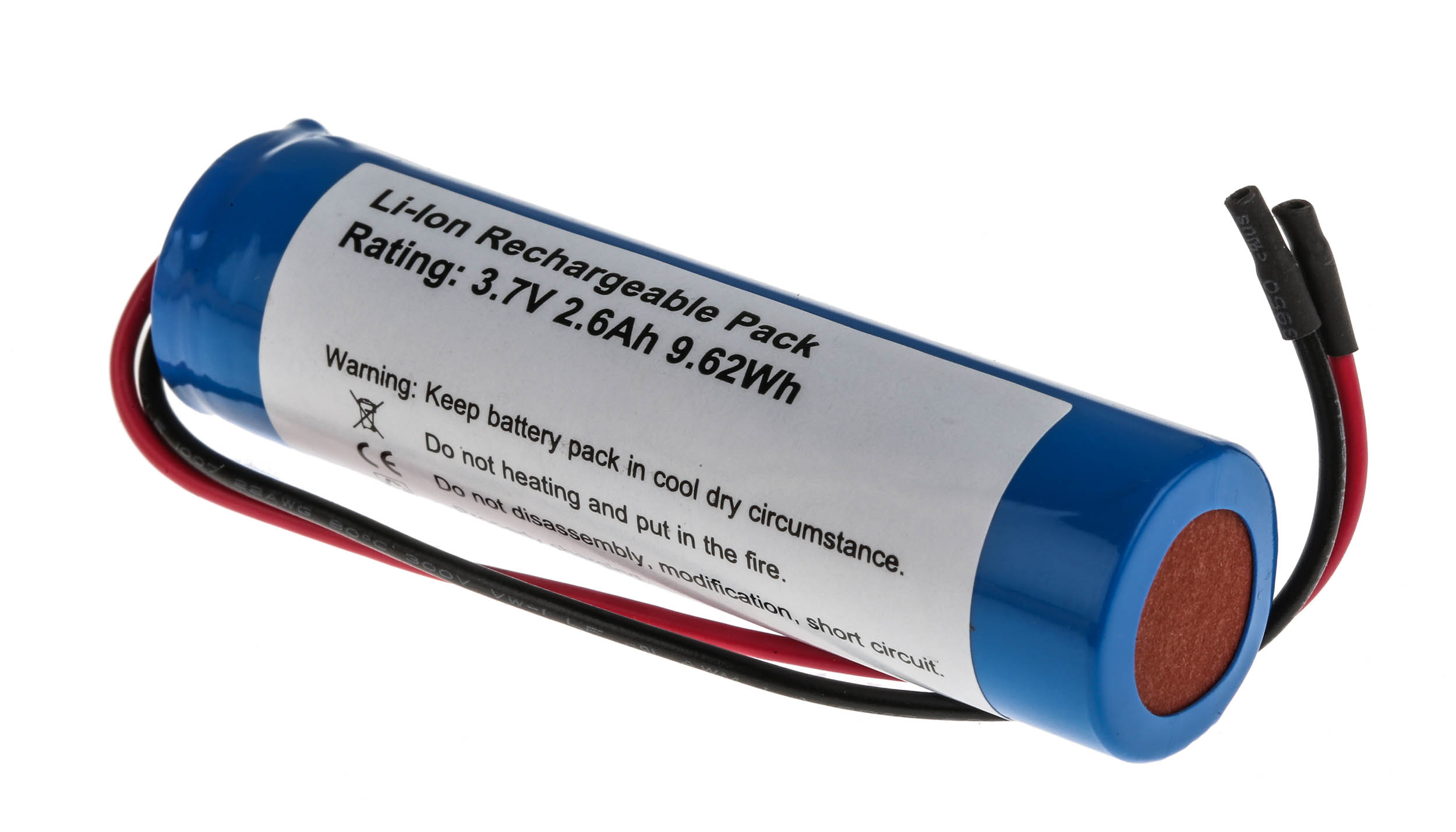 This is Li-Ion Rechargeable Battery 2600mAh manufactured by RS Pro. The manufacturer part number is 144-9406. The module has the capacity of 2.6ah. The terminal is a wire lead type. The product is available in 19 (dia.) x 69 mm size.