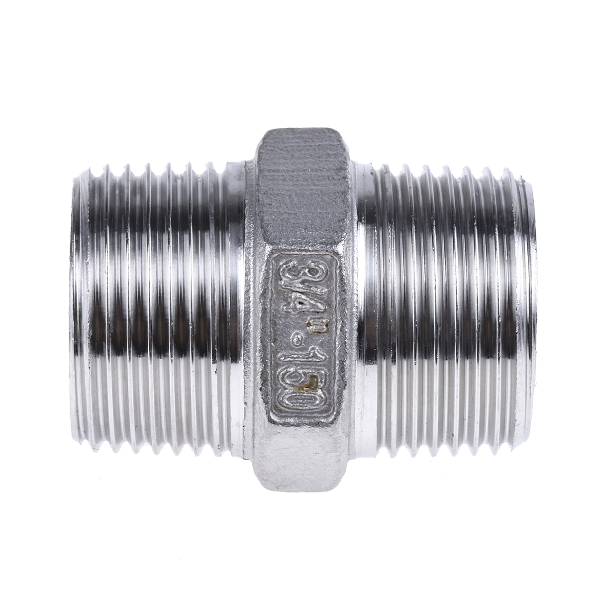This is Stainless Steel Hexagon Hexagon Nipple 3/4in R(T) Male x 3/4in R(T) Male 1.71in manufactured by RS Pro. The manufacturer part number is 499-3057. Its accurate length is 43.434mm. It is a hexagon product with unique specifications.