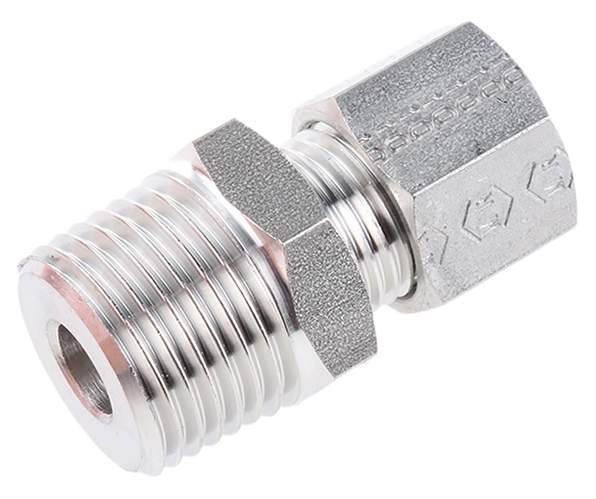 This is Stainless Steel Pipe Fitting Straight Coupler 1/2 in BSPT Male x10mm OD 8 MPa manufactured by Legris. The manufacturer part number is 1805 10 21. It is a hexagon product with unique specifications.