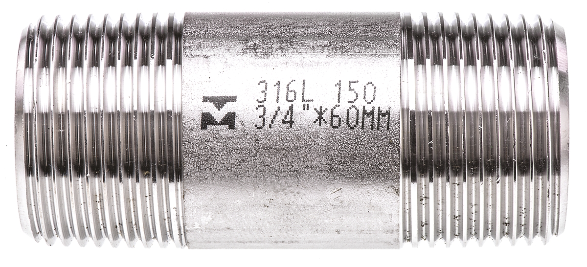 This is Stainless Steel Circular Barrel Nipple 3/4in R(T) Male x 3/4in R(T) Male 2.36in manufactured by RS Pro. The manufacturer part number is 499-3259. Its accurate length is 59.944mm. It is a circular product with unique specifications.