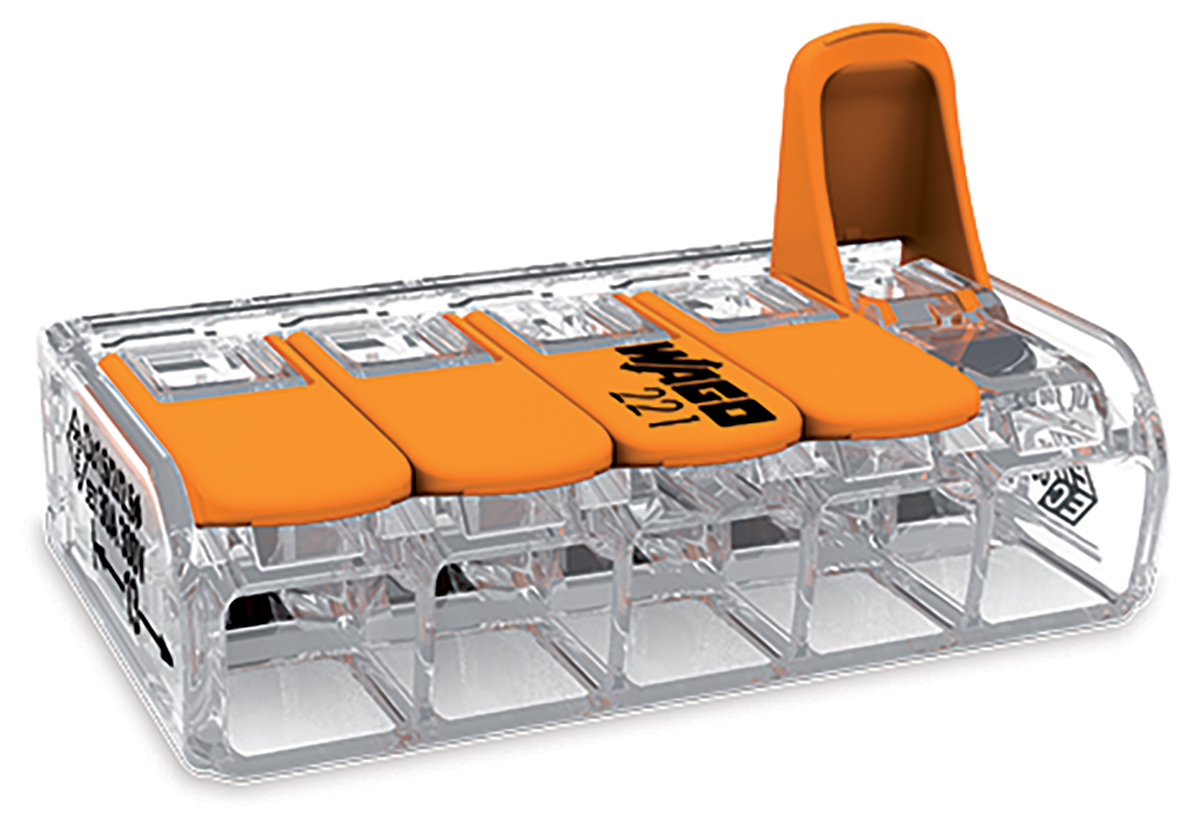 This is 221 Terminal Block Connector 5 Way/Pole Cage Clamp Terminals 0.5 → 6 mm² 20 → 10 AWG Cable Mount manufactured by Wago. The manufacturer part number is 221-615. The product has a current rating of 41a. The product is available in cable mount configuration. Moreover, the product has a nominal 450 v voltage rating. In addition, female is the available "Gender" of the product. The product 221, is a highly preferred choice for users. It has a maximum operating temperature of +105°c. The product is made from sturdy copper materials.