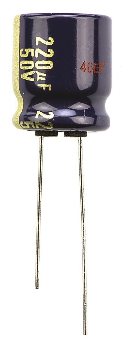 This is Aluminium Electrolytic Capacitor 220μF 50V dc 12.5mm FC Radial Series Through Hole Electrolytic ±20% manufactured by Panasonic. The manufacturer part number is EEUFC1H221S. Its diameter is 12.5mm. The given dimensions of the product include 12.5 (dia.) x 15mm. The product is available in radial, through hole configuration. The product fc, is a highly preferred choice for users. In addition, the height is 15mm. It provides a 220µf of capacitance value. It carries a 50v dc of voltage. It has a maximum operating temperature of +105°c. It features ±20% of tolerance value. Whereas, the minimum operating temperature of the product is -55°c. This product use aluminium electrolytic technology.
