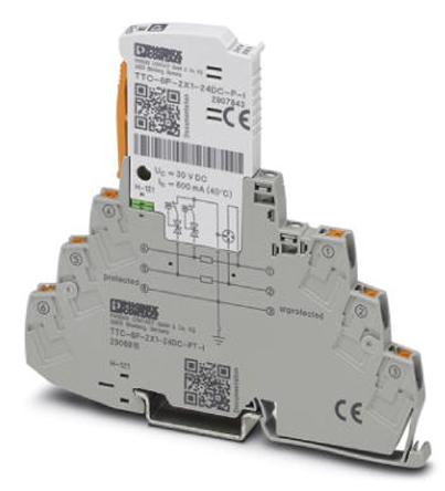 This is 30 V dc 10 (Discharge)kA TTC Surge Protection Device DIN Rail Mounting manufactured by Phoenix Contact. The manufacturer part number is 2906816. The given dimensions of the product include 100 x 6.2 x 105.8mm. The product is available in din rail configuration. The product ttc-6p-2x1-24dc-pt-i, is a highly preferred choice for users. Its accurate length is 100mm. In addition, the height is 105.8mm. The product comes in 6.2mm depth. Whereas, the minimum operating temperature of the product is -40°c. It has a maximum operating temperature of +85°c.
