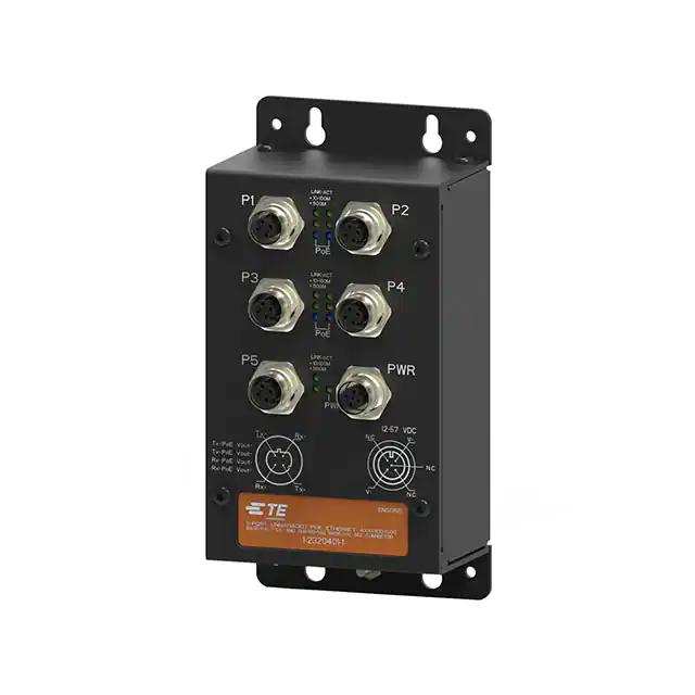 This is manufactured by TE Connectivity AMP Connectors. The manufacturer part number is 1-2320401-1. It is assigned with possible HTSUS value of 8517.62.0020. The product is rohs compliant. The product has -40°c ~ 75°c operating temperature range. The possible product's input voltage is 12 ~ 57vdc. It comes in switch - unmanaged configuration. Has copper type - 10/100. The product is available in fixed configuration. It is shipped in box. m12 Connector type offer robust functionality. Its typical moisture sensitivity level is not applicable. This product features 5 number of ports. It has a long 25 weeks standard lead time. It is IP rated with ip40. The product is available in chassis mount configuration. Consists 5 copper ports. Moreover, it corresponds to 2320401, a base product number of the product. The product is designated with the ear99 code number