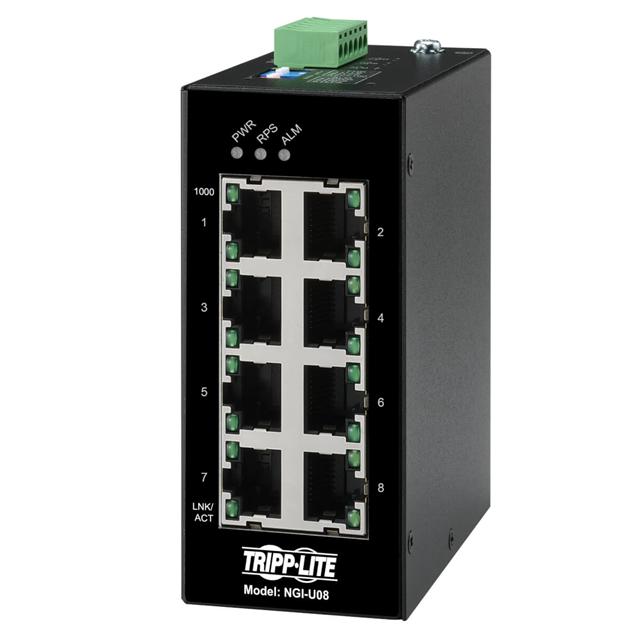 This is manufactured by Tripp Lite. The manufacturer part number is NGI-U08. It is assigned with possible HTSUS value of 8517.62.0020. The product is rohs3 compliant. The product has -40°c ~ 75°c operating temperature range. The possible product's input voltage is 9v ~ 57v. It comes in switch - unmanaged configuration. Has copper type - 10/100/1000. The product is available in fixed configuration. It is shipped in bulk. rj45 Connector type offer robust functionality. Its typical moisture sensitivity level is not applicable. This product features 8 number of ports. It has a long 2 weeks standard lead time. The product is available in din rail configuration. Consists 8 copper ports. The product is designated with the 5a991b1 code number
