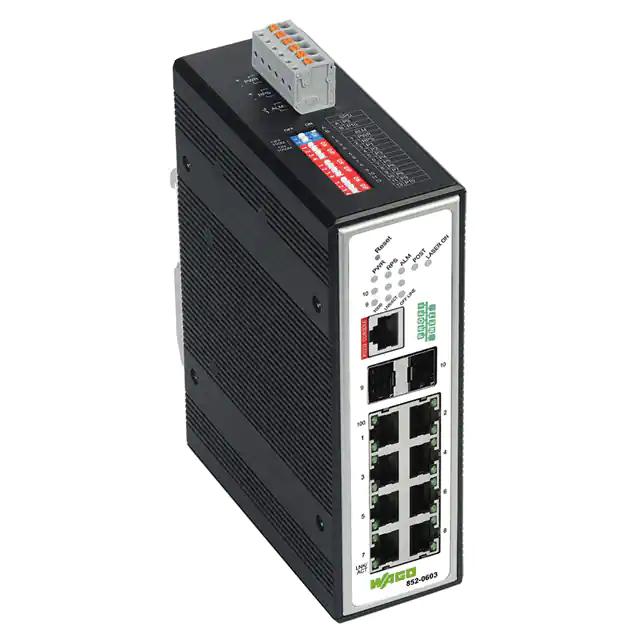 This is manufactured by WAGO Corporation. The manufacturer part number is 852-603. The product is rohs3 compliant. The product has -40°c ~ 70°c operating temperature range. The possible product's input voltage is 12v ~ 60v. It comes in switch - managed configuration. Has copper type - 10/100. 2 ports. The product is available in fixed + sfp configuration. It is shipped in box. rj45, lc, sfp Connector type offer robust functionality. Its typical moisture sensitivity level is not applicable. This product features 11 number of ports. It has a long 12 weeks standard lead time. It is IP rated with ip30. The product is available in din rail configuration. Consists 8 copper ports. It has a 1000base-sx/lx fiber. Includes 2 fiber ports.