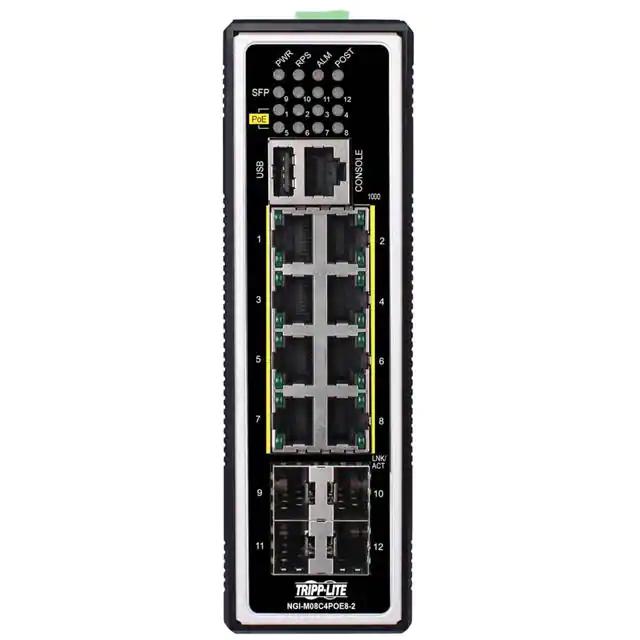 This is manufactured by Tripp Lite. The manufacturer part number is NGI-M08C4POE8-2. The product is rohs3 compliant. The product has -40°c ~ 75°c operating temperature range. The possible product's input voltage is 24v ~ 57v. It comes in switch - managed configuration. Has copper type - 10/100/1000. 4 ports. The product is available in fixed + sfp configuration. It is shipped in box. rj45, sfp Connector type offer robust functionality. Its typical moisture sensitivity level is not applicable. This product features 12 number of ports. It has a long 2 weeks standard lead time. It is IP rated with ip30. The product is available in din rail configuration. Consists 8 copper ports. It has a sfp fiber. Includes 4 fiber ports.