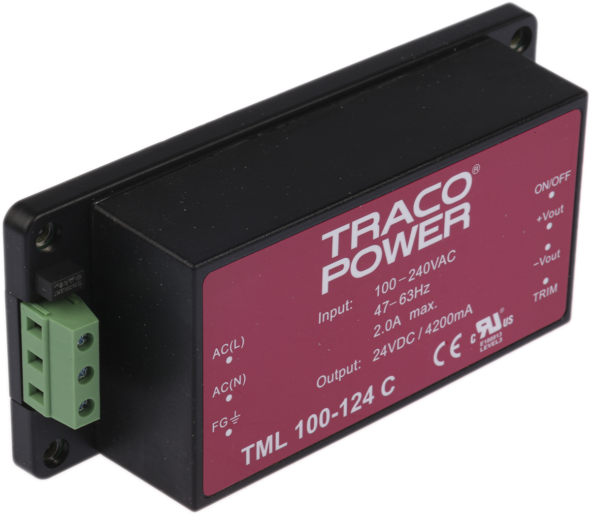 This is 100W Embedded Switch Mode Power Supply SMPS 4.2A 24V dc manufactured by TRACOPOWER. The manufacturer part number is TML 100-124C. Additionally, the product is supplied with 1 outputs. The product is available in chassis mount configuration. The typical product's weight is 440g. Furthermore, the product is 62mm wide. Its accurate length is 140mm. It is a highly efficient product with an 92.5 %, 93.5 % of high efficiency. The product comes in 36.6mm depth.