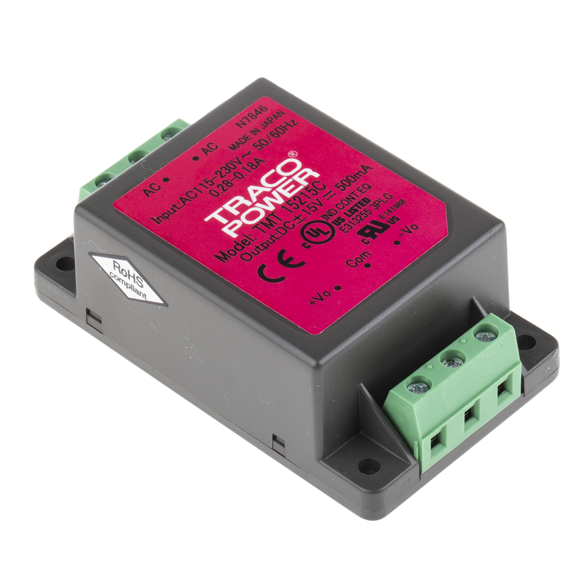 This is 15W Dual Output Embedded Switch Mode Power Supply SMPS 500mA ±15V dc Medical Approved manufactured by TRACOPOWER. The manufacturer part number is TMT 15215C. Additionally, the product is supplied with 2 outputs. The product is available in chassis mount configuration. The typical product's weight is 90g. Its accurate length is 77mm. Furthermore, the product is 45mm wide. The product comes in 26.4mm depth.