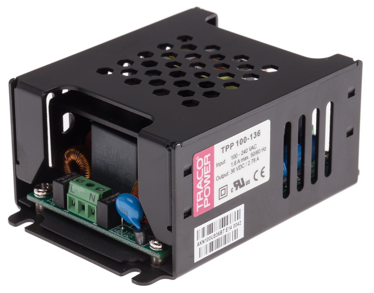 This is 100W Dual Output Embedded Switch Mode Power Supply SMPS 2.78A 36V dc Medical Approved manufactured by TRACOPOWER. The manufacturer part number is TPP 100-136. Additionally, the product is supplied with 2 outputs. The product is available in chassis mount configuration. The typical product's weight is 210g. Furthermore, the product is 50.8mm wide. The product comes in 76.2mm depth.
