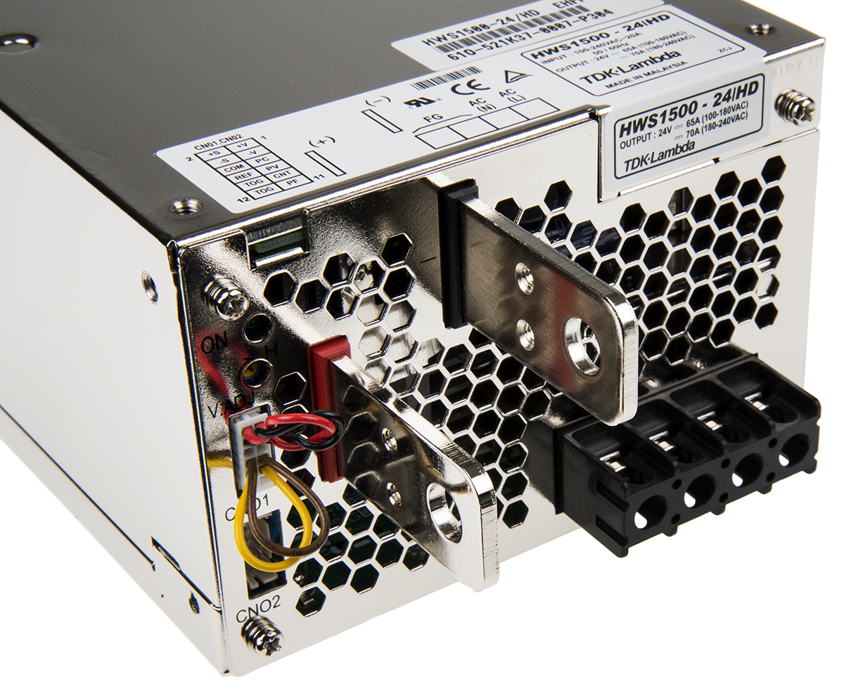 50W to 1500W, Universal Input, Single Output, Heavy Duty, HWS-50-1500/HD Series Exceptionally compact, requires typically 60% less space than previous generation products Heavy-duty power supplies designed to perform reliably in the harshest of environments Can start up at temperatures as low as -40°C Conformal coating applied to both sides of the PCB, allowing use adverse environmental conditions LED indicator for power on Easy installation - screw terminals Adjustable output voltage (±20%) Power factor correction to EN 61000-3-2 EMC meets EN 55022-B, FCC-B (curve A for HWS1500) Over-voltage and over-current protection Open frame construction 50 to 150W 300 to 1500W are enclosed and have built-in fan Meet MIL-STD-810F standards for vibration and shock Note Dimensions quoted exclude terminal block. Peak load for 10ms max on time, 35% duty cycle. De-rate above 50°C. Approvals UL recognised, CSA Standards EN 60950-1, UL 60950-1, CSA 60950-1, EN 50178 Approvals UL recognised, CSA
