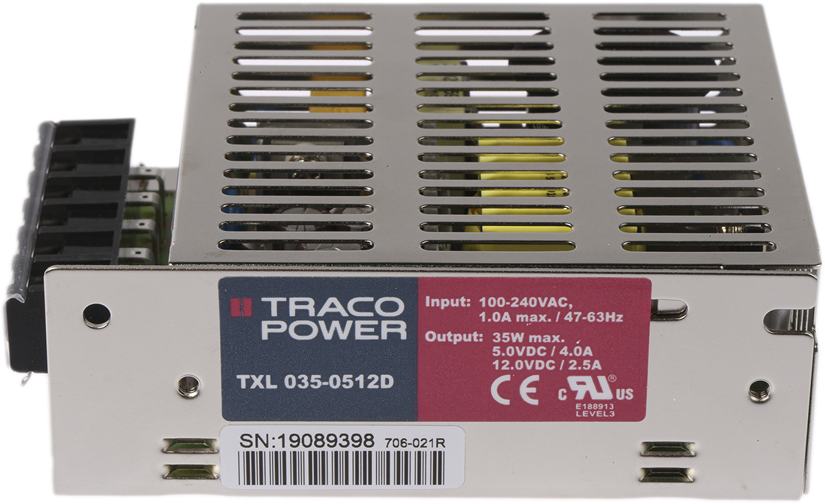 This is 35W Dual Output Embedded Switch Mode Power Supply SMPS 2.5 A 4 A 5/12V dc manufactured by TRACOPOWER. The manufacturer part number is TXL 035-0512D. Additionally, the product is supplied with 2 outputs. The product is available in chassis mount configuration. The typical product's weight is 300g. It is a highly efficient product with an 70 → 84% of high efficiency. The product txl, is a highly preferred choice for users. Its accurate length is 109mm. Furthermore, the product is 82mm wide. The product comes in 35mm depth.