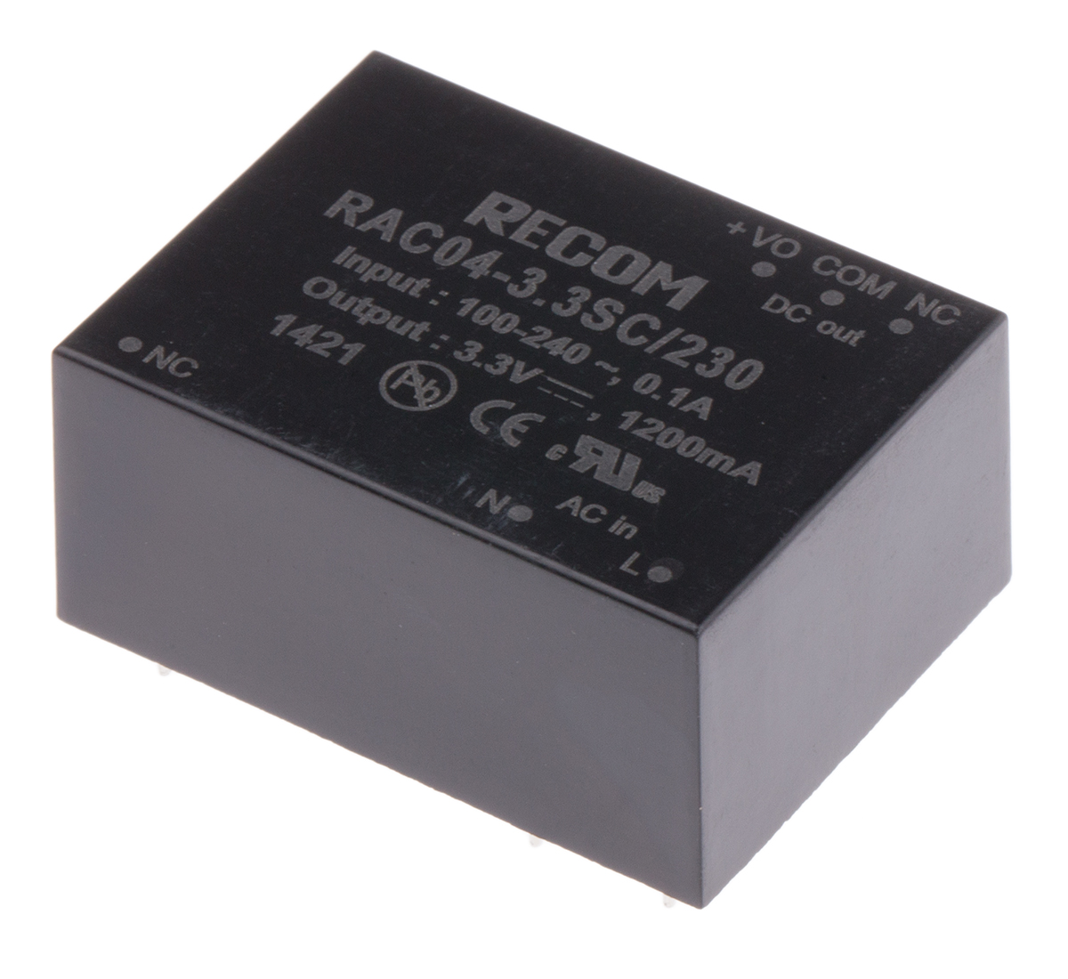 This is 4W Embedded Switch Mode Power Supply SMPS 1.2A 3.3V dc manufactured by Recom. The manufacturer part number is RAC04-3.3SC/230. Additionally, the product is supplied with 1 outputs. The product is available in pcb mount configuration. Furthermore, the product is 27.2mm wide. The product rac04-c/230, is a highly preferred choice for users. Its accurate length is 36.7mm. It is a highly efficient product with an 72% of high efficiency. The product comes in 17.1mm depth.