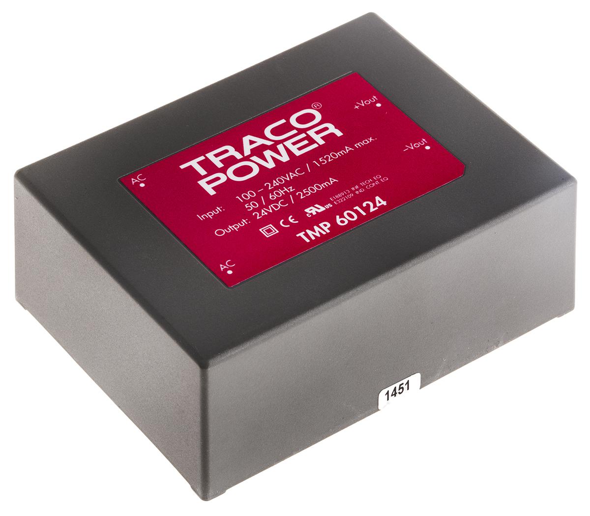 This is 60W Embedded Switch Mode Power Supply SMPS 2.5A 24V dc manufactured by TRACOPOWER. The manufacturer part number is TMP 60124. Additionally, the product is supplied with 1 outputs. The product is available in pcb mount configuration. The typical product's weight is 345g. Furthermore, the product is 67.5mm wide. Its accurate length is 89mm. It is a highly efficient product with an 84% of high efficiency. The product comes in 34mm depth.