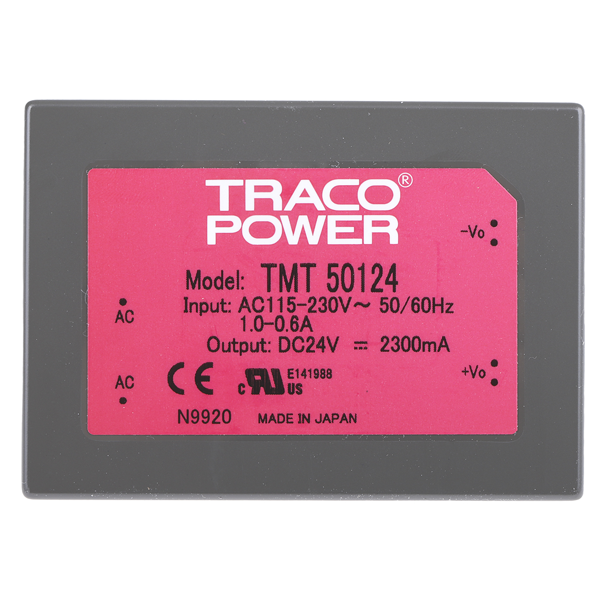 This is 50W Embedded Switch Mode Power Supply SMPS 2.3A 24V dc Medical Approved manufactured by TRACOPOWER. The manufacturer part number is TMT 50124. Additionally, the product is supplied with 1 outputs. The product is available in pcb mount configuration. The typical product's weight is 245g. Its accurate length is 89mm. Furthermore, the product is 64mm wide. The product comes in 32mm depth.