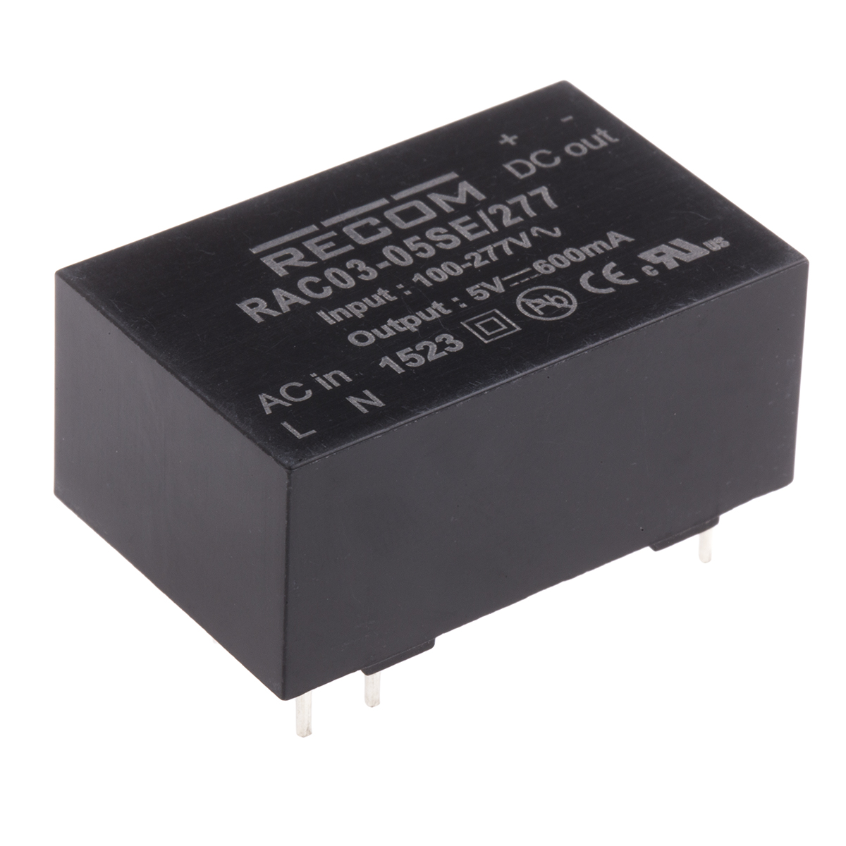 This is 3W Embedded Switch Mode Power Supply SMPS 600mA 5V dc manufactured by Recom. The manufacturer part number is RAC03-05SE/277. Additionally, the product is supplied with 1 outputs. The product is available in through hole configuration. The typical product's weight is 28g. It is a highly efficient product with an 76% of high efficiency. The product rac03-se/277, is a highly preferred choice for users. Its accurate length is 38.25mm. Furthermore, the product is 24.35mm wide. The product comes in 17.4mm depth.