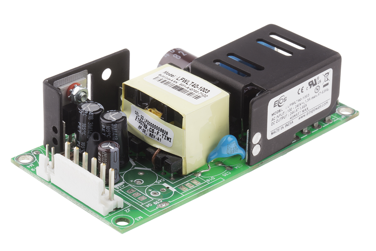 This is 40W Embedded Switch Mode Power Supply SMPS 1.7A 24V manufactured by EOS. The manufacturer part number is LFWLT40-1003. Additionally, the product is supplied with 1 outputs. The product is available in chassis mount configuration. The typical product's weight is 150g. Furthermore, the product is 50.8mm wide. Its accurate length is 101.6mm. It is a highly efficient product with an 85% of high efficiency. The product comes in 30.48mm depth.