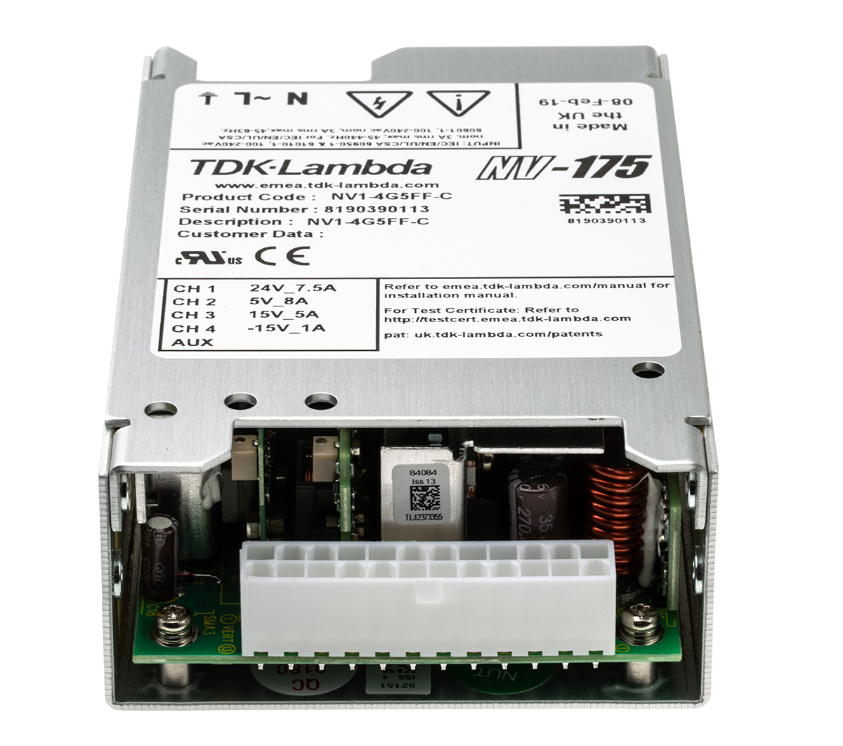 This is 180W Quad Output Embedded Switch Mode Power Supply SMPS 1 A 4 A 7.5 A 8 A 5/±15/24V dc Medical Approved manufactured by TDK-Lambda. The manufacturer part number is NV1-4G5FF-C. Additionally, the product is supplied with 4 outputs. The product is available in chassis mount configuration. The typical product's weight is 250g. Its accurate length is 127mm. Furthermore, the product is 76mm wide. The product comes in 31.75mm depth.