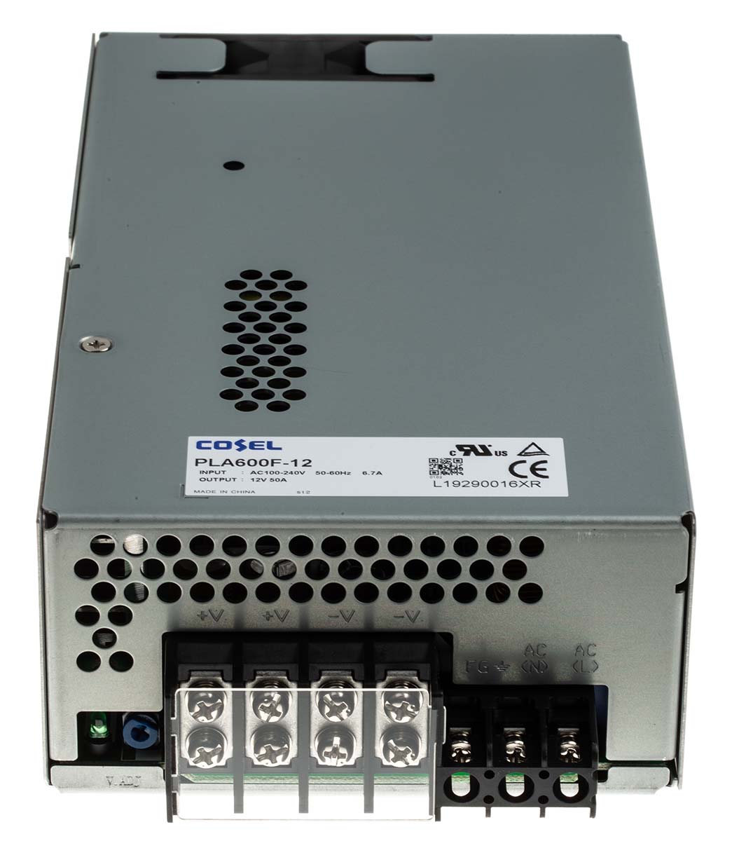 This is 600W Embedded Switch Mode Power Supply SMPS 50A 12V dc manufactured by Cosel. The manufacturer part number is PLA600F-12. Additionally, the product is supplied with 1 outputs. The product is available in chassis mount configuration. The typical product's weight is 2kg. Furthermore, the product is 61mm wide. Its accurate length is 239mm. It is a highly efficient product with an 84% of high efficiency. The product comes in 120mm depth.