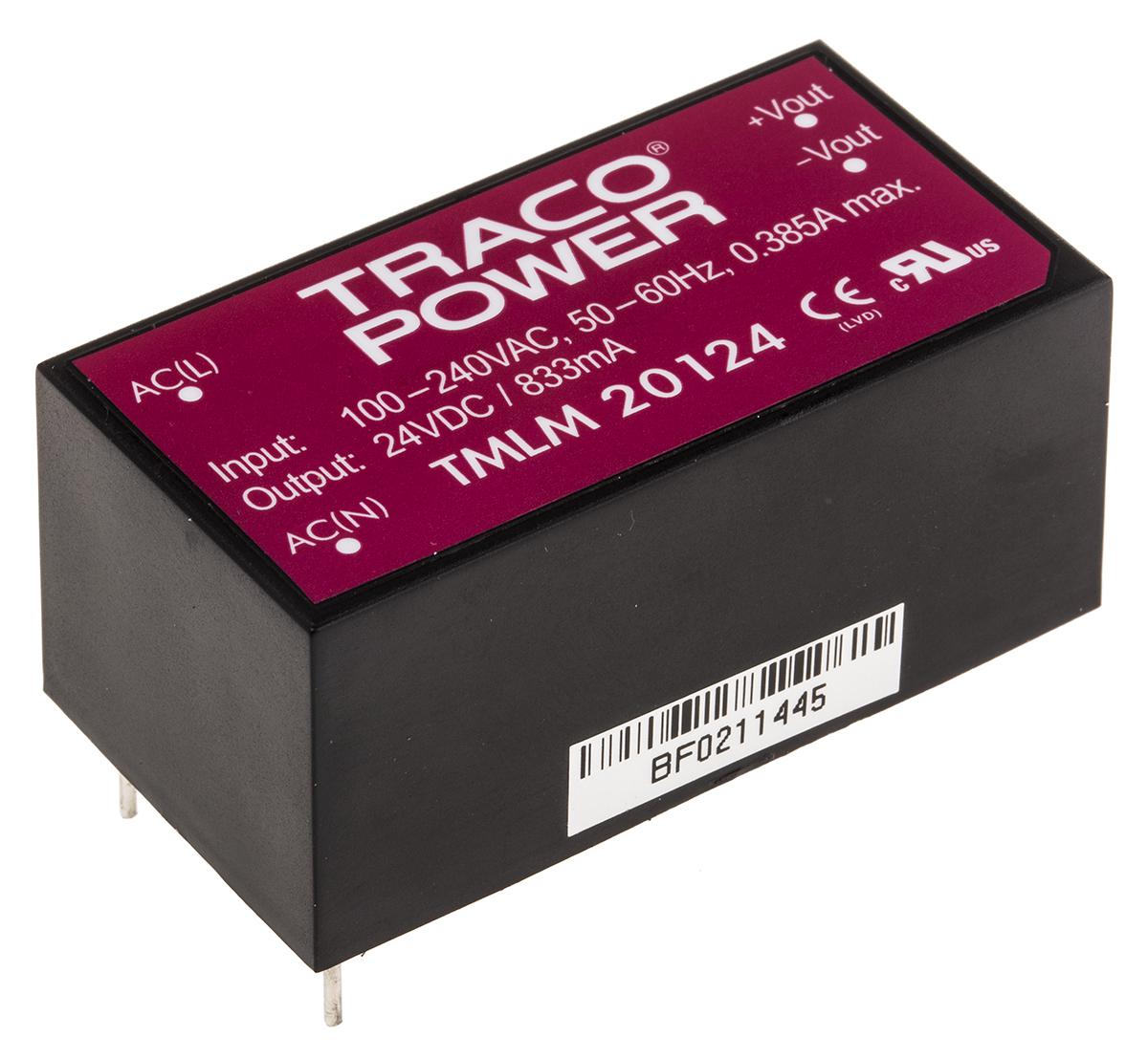 This is 20W Embedded Switch Mode Power Supply SMPS 833mA 24V dc manufactured by TRACOPOWER. The manufacturer part number is TMLM 20124. Additionally, the product is supplied with 1 outputs. The product is available in pcb mount configuration. The typical product's weight is 59g. Furthermore, the product is 27.2mm wide. Its accurate length is 52.4mm. It is a highly efficient product with an 83% of high efficiency. The product comes in 23.5mm depth.