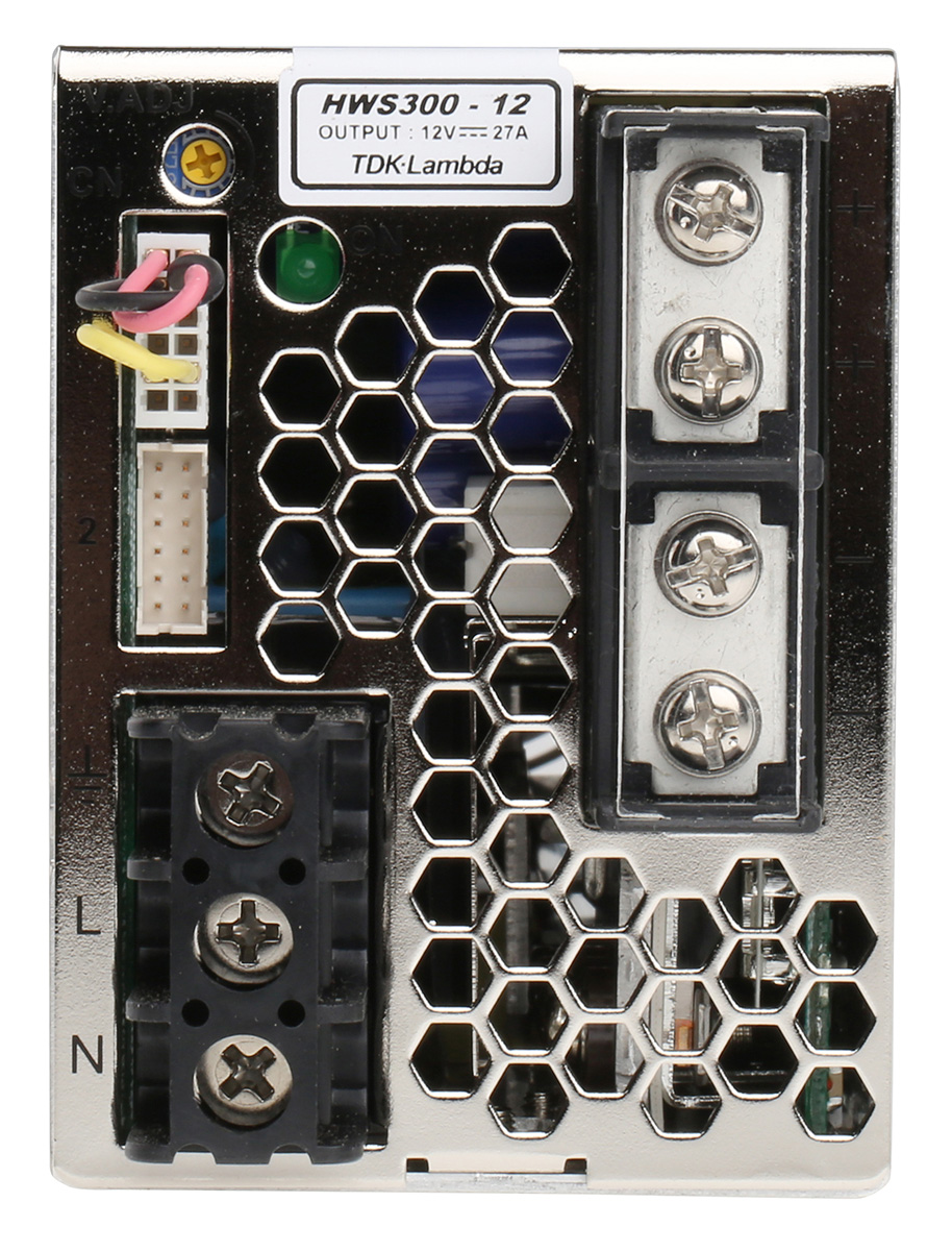 This is 324W Embedded Switch Mode Power Supply SMPS 27A 12V dc manufactured by TDK-Lambda. The manufacturer part number is HWS300-12. Additionally, the product is supplied with 1 outputs. The product is available in chassis mount configuration. The typical product's weight is 1kg. Furthermore, the product is 3.23in wide. Its accurate length is 6.5in. It is a highly efficient product with an 83% of high efficiency. The product comes in 2.4in depth.