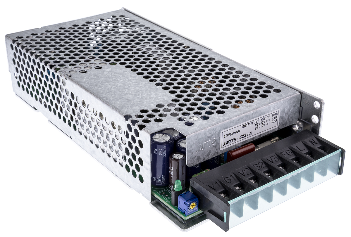 This is 75W Triple Output Embedded Switch Mode Power Supply SMPS 4 A 8 A 500 mA 5/±12V dc manufactured by TDK-Lambda. The manufacturer part number is JWT75-522/A. Additionally, the product is supplied with 3 outputs. The product is available in chassis mount configuration. The typical product's weight is 600g. Furthermore, the product is 92mm wide. Its accurate length is 188mm. It is a highly efficient product with an 72% of high efficiency. The product comes in 42mm depth.