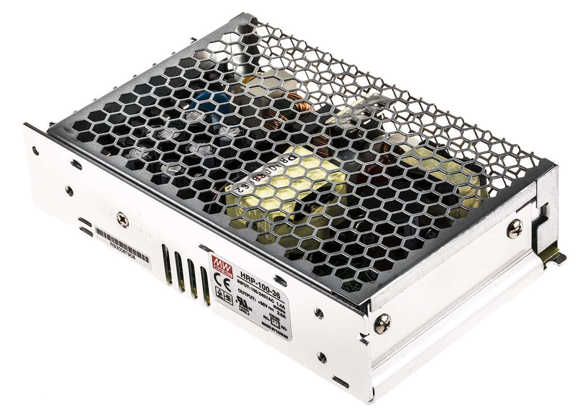 This is 104W Embedded Switch Mode Power Supply SMPS 2.9A 36V dc manufactured by Mean Well. The manufacturer part number is HRP-100-36RS. Additionally, the product is supplied with 1 outputs. The product is available in chassis mount configuration. The typical product's weight is 380g. Furthermore, the product is 97mm wide. Its accurate length is 159mm. It is a highly efficient product with an 89% of high efficiency. The product comes in 38mm depth.