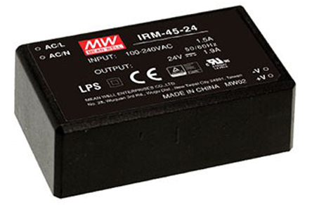 This is 45.6W Encapsulated Switch Mode Power Supply 1.9A 24V dc manufactured by Mean Well. The manufacturer part number is IRM-45-24. Additionally, the product is supplied with 1 outputs. The product is available in pcb mount configuration. The typical product's weight is 230g. Its accurate length is 87mm. Furthermore, the product is 52mm wide. The product comes in 29.5mm depth.