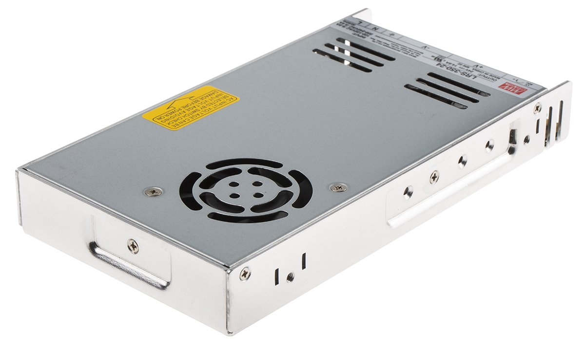 This is 350W Embedded Switch Mode Power Supply SMPS 14.6A 24V dc manufactured by Mean Well. The manufacturer part number is LRS-350-24RS. Additionally, the product is supplied with 1 outputs. The product is available in chassis mount configuration. The typical product's weight is 760g. Furthermore, the product is 115mm wide. Its accurate length is 215mm. It is a highly efficient product with an 88% of high efficiency. The product comes in 30mm depth.