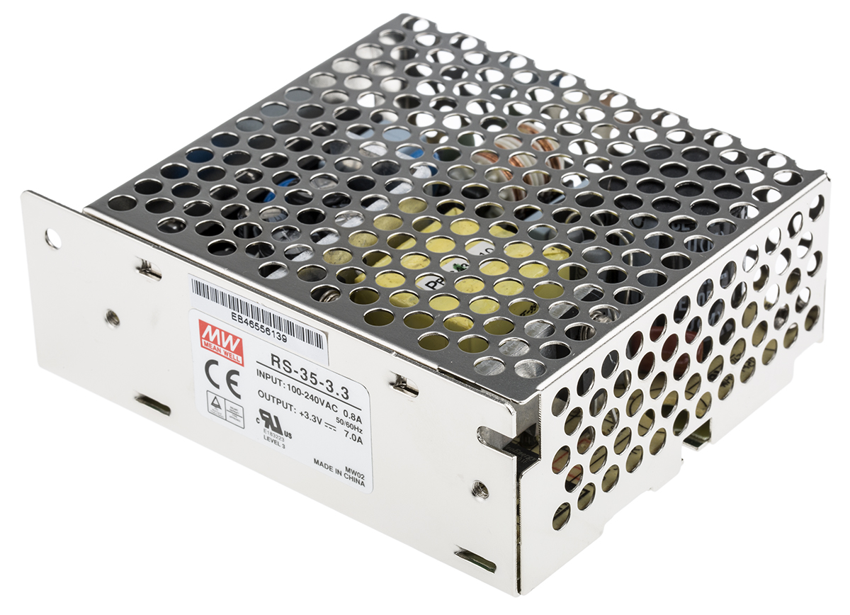 This is 23W Embedded Switch Mode Power Supply SMPS 7A 3.3V dc manufactured by Mean Well. The manufacturer part number is RS-35-3.3. Additionally, the product is supplied with 1 outputs. The product is available in chassis mount configuration. The typical product's weight is 300g. Furthermore, the product is 82mm wide. Its accurate length is 99mm. It is a highly efficient product with an 76.5% of high efficiency. The product comes in 36mm depth.
