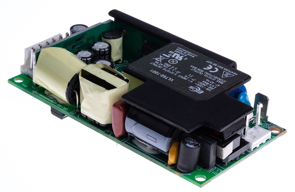 This is 60W Embedded Switch Mode Power Supply SMPS 5A 12V dc manufactured by EOS. The manufacturer part number is LFVLT60-1001. Additionally, the product is supplied with 1 outputs. The product is available in chassis mount configuration. The typical product's weight is 150g. Furthermore, the product is 51.8mm wide. Its accurate length is 101.6mm. It is a highly efficient product with an 82% of high efficiency. The product comes in 27.18mm depth.
