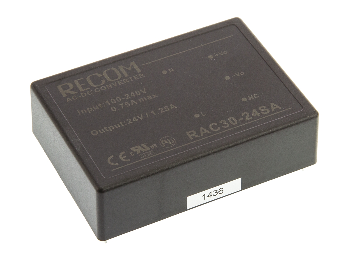 This is 30W Embedded Switch Mode Power Supply SMPS 1.25A 24V dc manufactured by Recom. The manufacturer part number is RAC30-24SA. Additionally, the product is supplied with 1 outputs. The product is available in pcb mount configuration. The typical product's weight is 212g. It is a highly efficient product with an 82% of high efficiency. The product rac30-a, is a highly preferred choice for users. Its accurate length is 89mm. Furthermore, the product is 63.5mm wide. The product comes in 25mm depth.