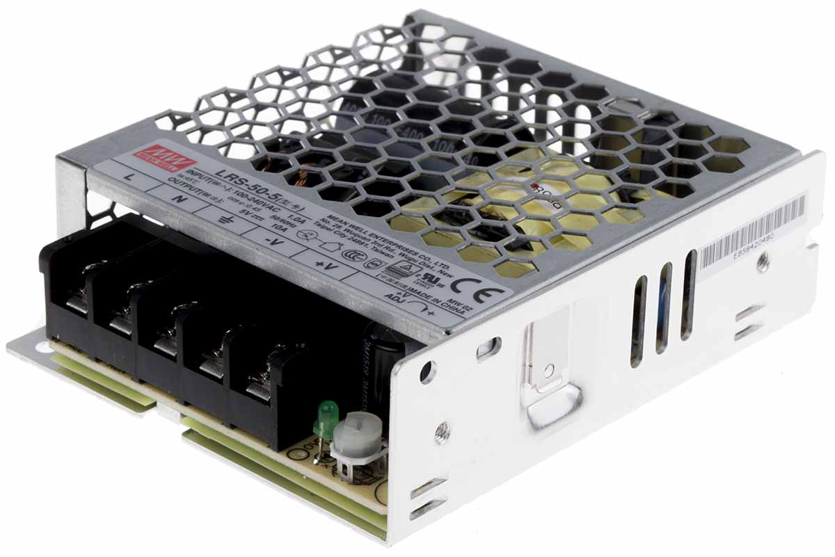 This is 50W Embedded Switch Mode Power Supply SMPS 10A 5V dc manufactured by Mean Well. The manufacturer part number is LRS-50-5. Additionally, the product is supplied with 1 outputs. The product is available in chassis mount configuration. The typical product's weight is 230g. Its accurate length is 99mm. Furthermore, the product is 82mm wide. The product comes in 30mm depth.