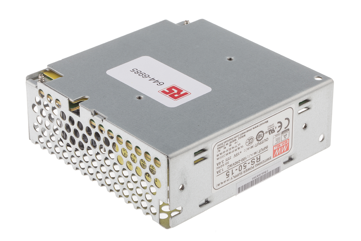 This is 51W Embedded Switch Mode Power Supply SMPS 3.4A 15V dc manufactured by Mean Well. The manufacturer part number is RS-50-15. Additionally, the product is supplied with 1 outputs. The product is available in chassis mount configuration. The typical product's weight is 410g. Furthermore, the product is 97mm wide. Its accurate length is 99mm. It is a highly efficient product with an 86% of high efficiency. The product comes in 36mm depth.